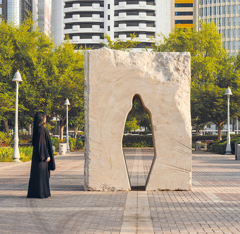 For the inaugural Public Art Abu Dhabi Biennial, Jaber participates with Clearing, which features an anthropomorphic opening carved into a three-metre-tall block of marble. The passage invites contemplation. Photo: Lance Gerber.
