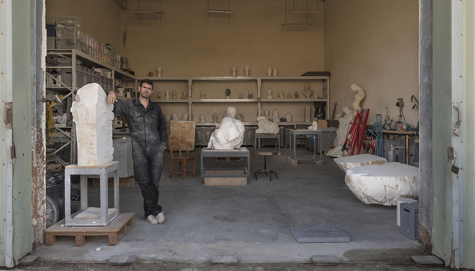 The UAE attracted him because it is in what he calls its “golden age,” particularly regarding its investment in culture. Europe is in crisis, he believes, and he feels more energised here. After the year-long challenge of transporting his studio from Belgium, he is back at work in Musaffah, Abu Dhabi’s industrial area. The neighbourhood is fitting, he says. High ceilinged and airy, the studio features orderly shelves filled with busts that gaze down at large marble slabs waiting for Jaber’s attention. It is more than a workspace. “It’s the first dedicated stone-carving studio in the region, which gives it immense potential to become a hub for sculpture—a place where people can gather to learn about the craft through tours, events, and classes,” he says.