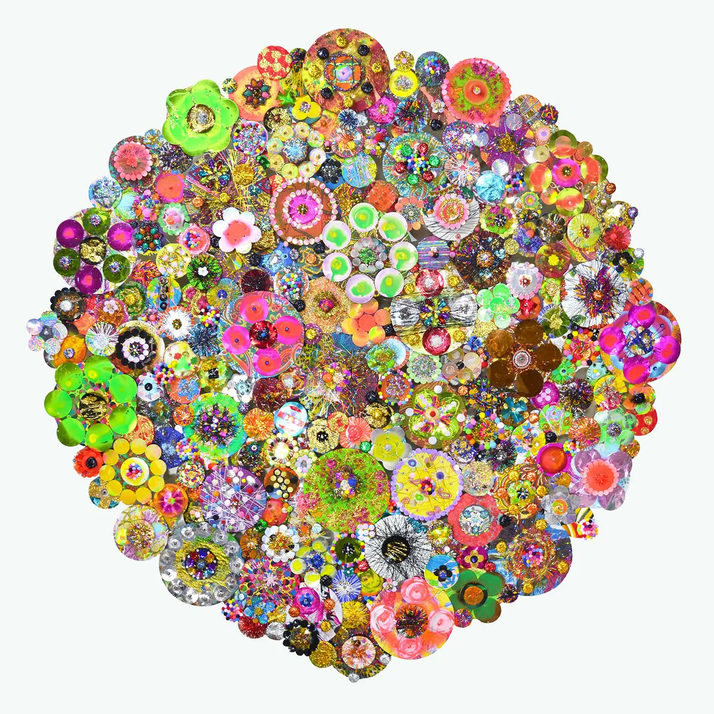 Al Banna’s studio is nestled away in an outbuilding on the family farm that falls beyond the scope of Google Maps, located down a dusty track on the desert outskirts of Sharjah city. Visiting him there, his yearning for a way of life once lived is clear. Yet, stepping inside his studio is a peek inside his hive-like mind. The walls are covered with his artwork, which is an exploration into colour and form. Perhaps the most striking of these are three circular panels hanging on the largest wall. They are a riot of texture and tone comprised of hundreds of thousands of pieces of shredded material, sourced from the ubiquitous textile markets in downtown Sharjah. The fuchsia pinks, neon greens, deep purples, crimsons and blues merge together in an almost Pollock-like splattering of colour yet the artworks are thick with texture too. The material is the kind that Emirati women traditionally use to make dresses and would be worn under the black abaya. Adding layers to the bold and bright colours are embellishments such as traditional talli embroidery, metallic threads, crystals, beads and mirrors. As a final touch, Al Banna has stiffened the fabric with glue—sometimes adding a sprinkling of glitter too—and the finished products are not only pleasing to the eye, but finely balanced pieces of art that are rich in both composition and meaning.