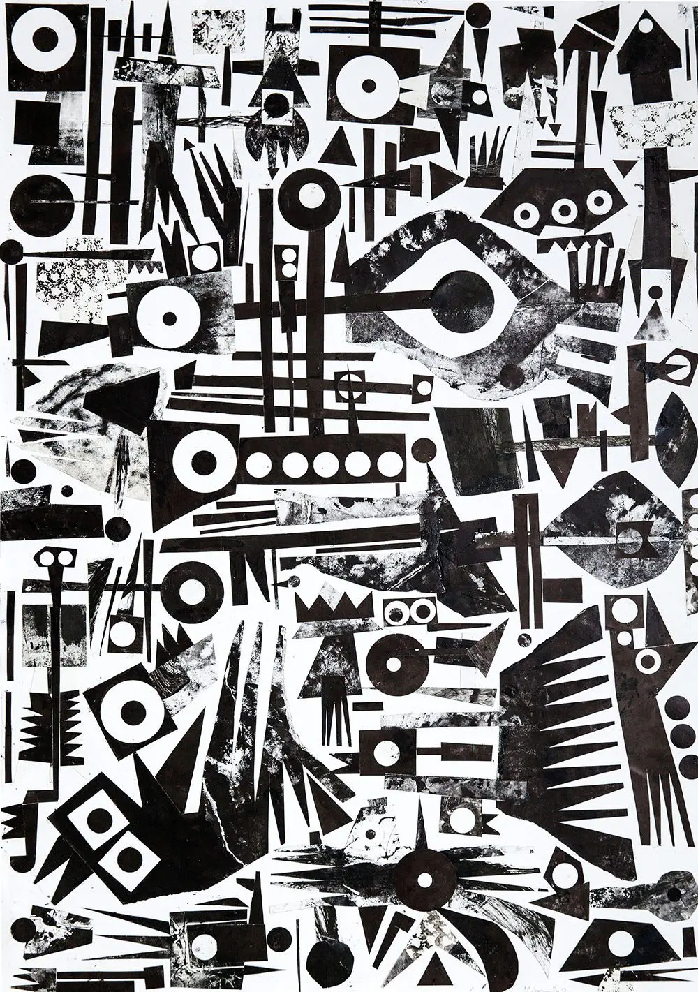 “It began with the etching but then I saw all the tones that you can get from using only black, so I started to try to control this and spent many years working only in black and white,” he explains. His monotone works also started his journey into collage, which is the one element that defines Al Banna’s varied practice today. He has moved into many media, including glass, plastic, wire sculpture and paper but they are all, in one way or another, collages.