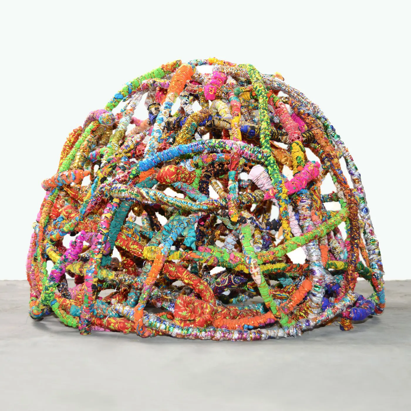 DYNAMIC OF MOTION (2019) (above)—Al Banna uses textiles to address how traditions change and are diluted in a rapidly evolving consumerist era. GARGOUR 1 (2021)—This sculptural composition has steel rods wrapped in multi-hued fabrics redolent of traditional fishing nets in the UAE. A continuation of Al Banna’s research into Emirati heritage.