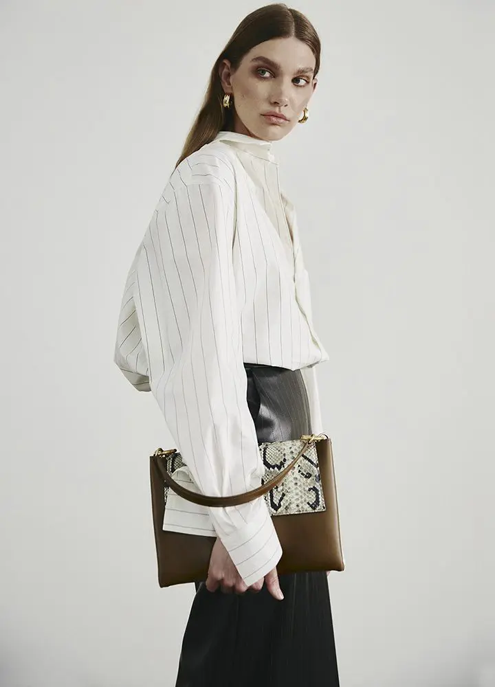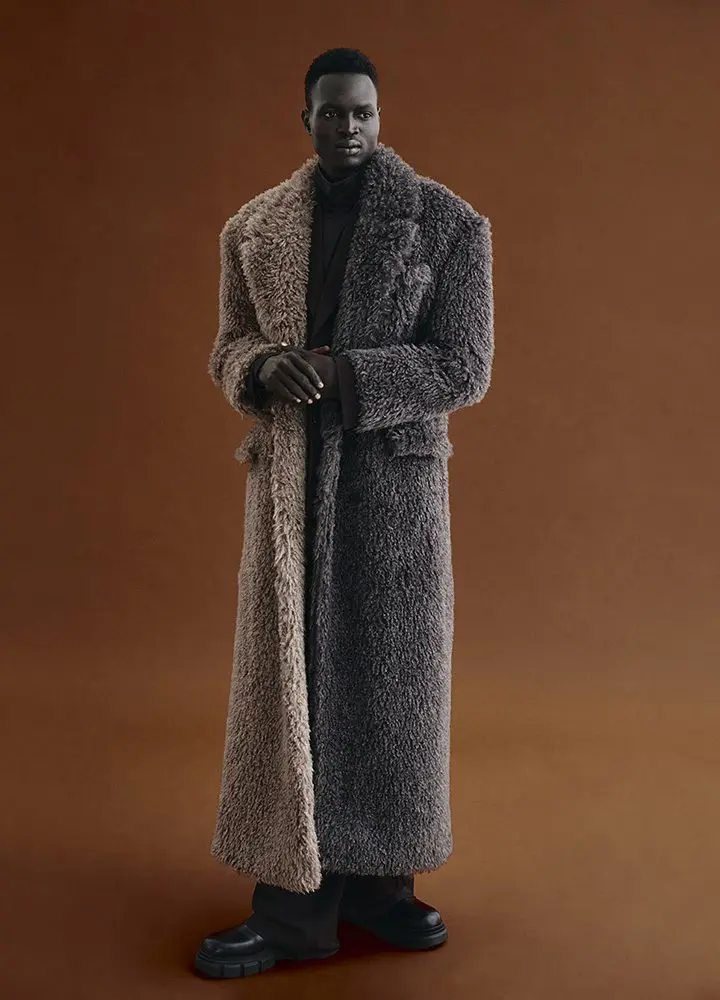 For FW23, signature architectural lines are balanced by natural materials in earthy, muted tones and elegant but humble cuts. In these images above, the men’s Jad Faux Fur Coat and women’s Maya Oversized Shirt, Irina Faux Leather Skirt and Ounassa Handbag.