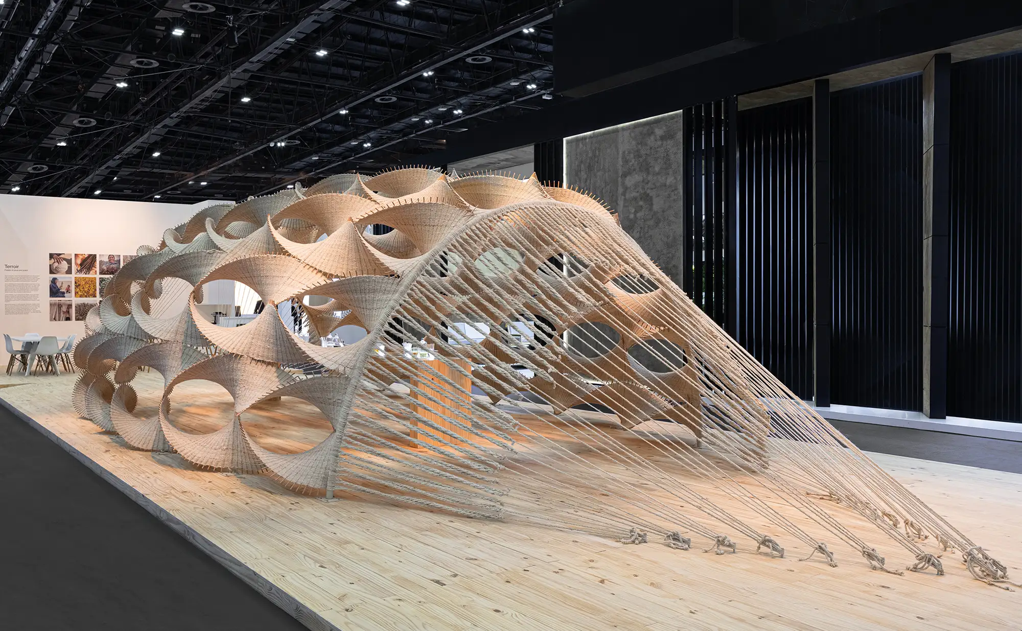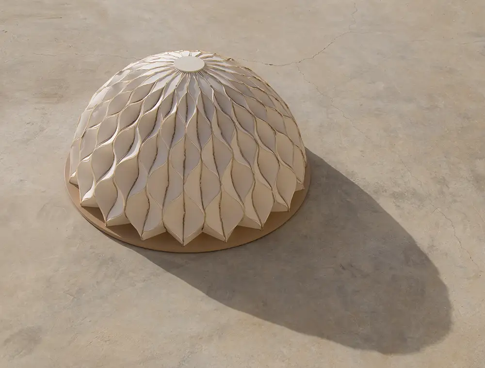No wonder then that her pieces often convey a sense of movement and dynamism. Terroir (2022–ongoing) pays homage to the Bedouin ground loom—their “nucleus of communal interaction,” she says—and en- larges it into an occupiable cultural space, illustrating how traditional craft can inform contemporary design. These looms, when lined with layers of yarn pulled taught, exude a high degree of energy and tension. Seikaly pushes this further, though, by making Terroir’s woven form into a series of undulating spirals that appear to spin into infinity.