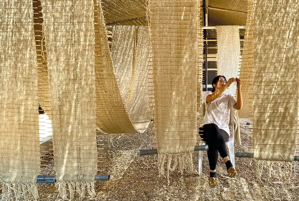 Critical to this system are those who make and use the work. In the case of Weaving a Home, she stresses that what matters most is the empowerment and dignity these shelters provide their residents. “How can you engage people in the process and make them feel they have a sense of agency in terms of making decisions and developing things?” she asks. One answer that excites her is creating an open-source model. “Then people in different parts of the world can apply this form or the principles behind it using their own materials.” While she admits she isn’t ego-less, she says that neither her signature as the maker nor her style are important. She is just as much an equal part of the system as any other component.