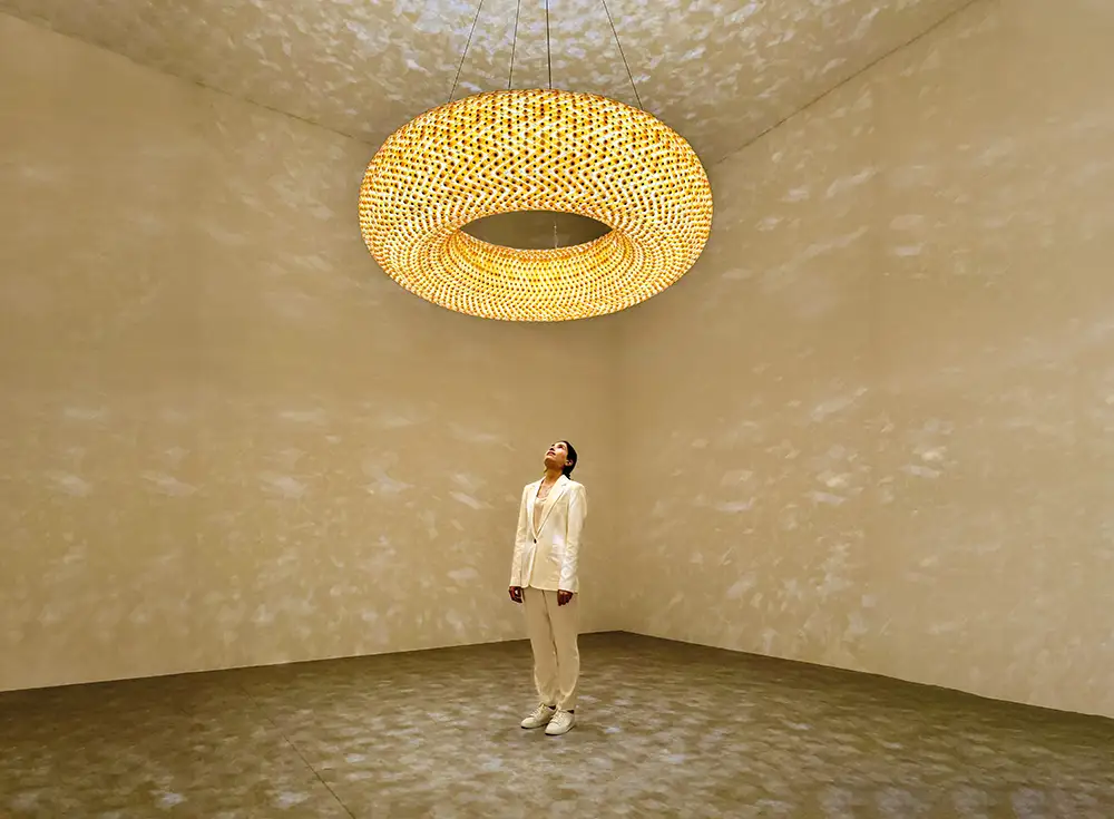 Opening image: Terroir (2022–ongoing). A handwoven structure that merges traditional Bedouin weaving techniques with contemporary design practices. Above, Constellations 2.0 Object. Light. Consciousness (2023). A suspended light sculpture of thousands of Murano glass tiles, handwoven into a structural mesh. Terroir photo by Rami Mansour. Constellations by Abeer Seikaly.