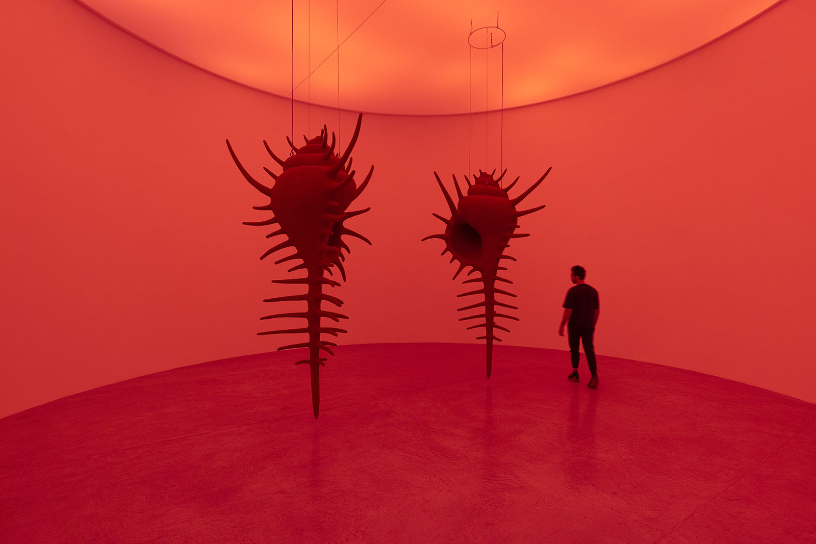 Water is a protagonist. On the port side of Sharjah Art Foundation’s Al Mureijah district, an exhibition-cum-showroom hosted by SERAPIS MARITIME, a hybrid art, design and fashion entity based in Greece, contains public seating made from boat scraps and other marine industry materials and offers views of Sharjah’s shipyards. Inside the coral-walled neighbourhood, which is home to SAF’s six white-walled galleries, several more artworks pay tribute to maritime and coastal traditions. Monira Al Qadiri, whose practice often interrogates the ecological effects of oil extraction, presents Gastromancer (2023), two large fiberglass seashells suspended in a bath of red light. While Stephanie Comilang’s film Search for Life II (2025) explores themes of migration, labour, diaspora, and technology through the history of pearl diving, and is projected onto a screen fashioned from 500 strings of pearls.