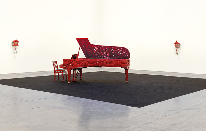 Top: Risham Syed’s installation Unn, Pani, Sut (Grain, Water, Truth) (2024) brings together agrarian, sonic and kinetic rhythms, centring the wheat field and granary as protagonists for exploring notions of generosity, sacred transfer and distribution in Sikh philosophy. Above: Michael Parekōwhai is a leading conceptual artist based in Aotearoa New Zealand. His work He Kōrero Pūrakau mo Te Awanui o Te Motu: Story of a New Zealand river (2011) is a Steinway concert grand piano that has been intricately carved with Māori motifs.