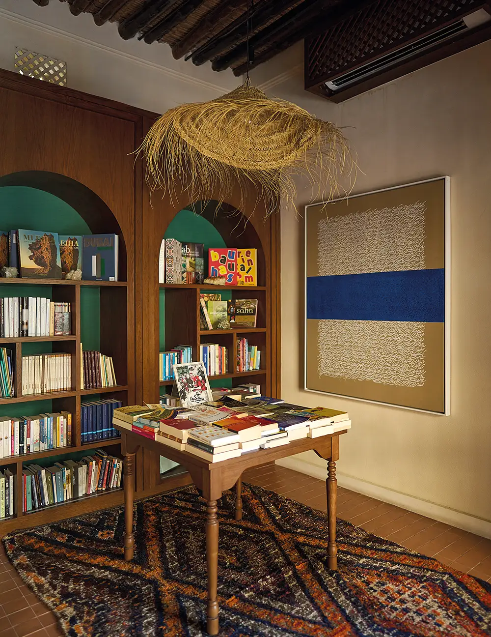 Al Kutubkhana, top, meaning “House of Books” is a curated bookstore offering a diverse selection of Arabic and English literature. Above, dining at Bait Elowal is itself a journey, inspired by the Silk Road.