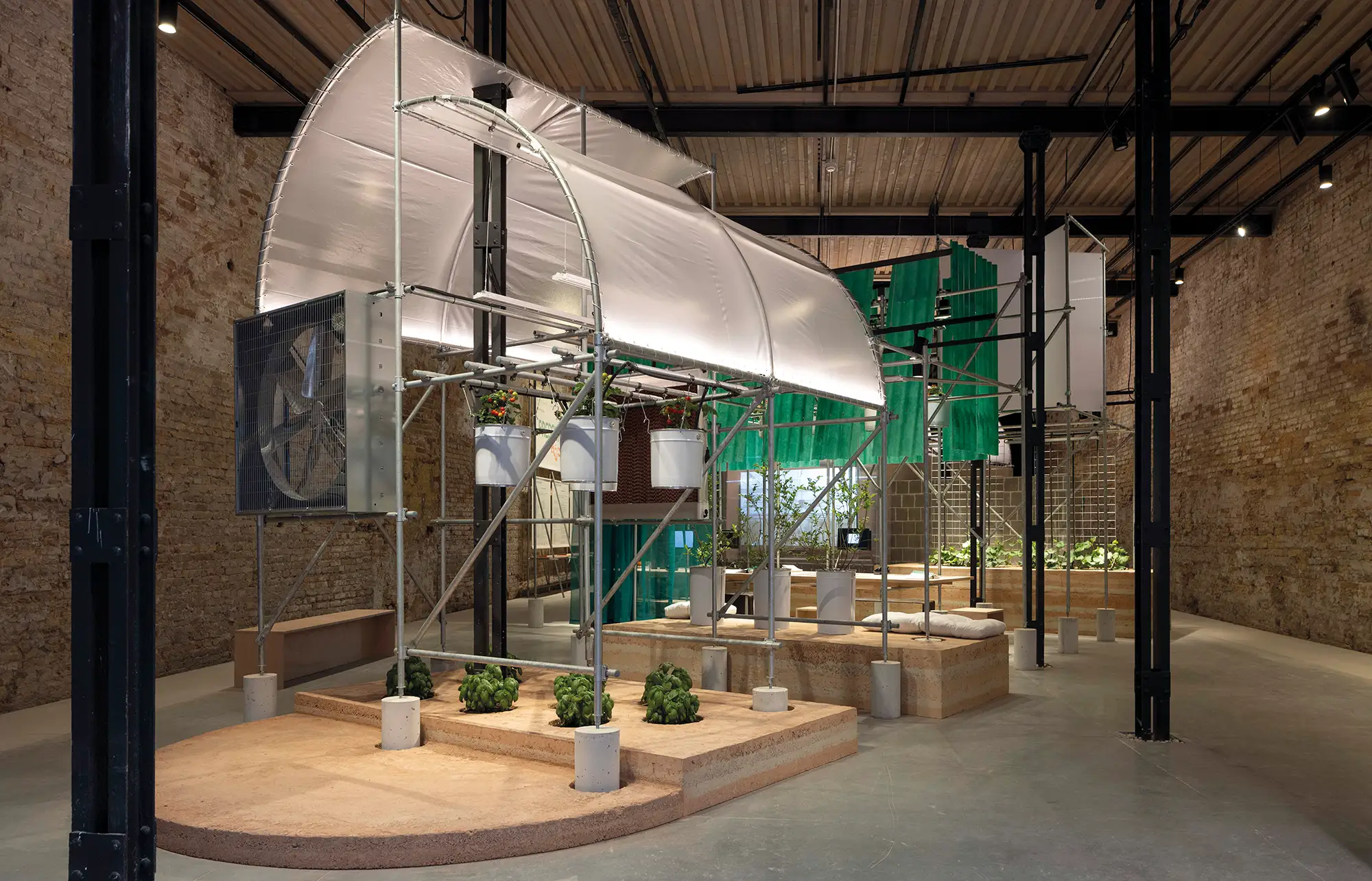 Above left, rammed-earth platforms mitigate heat from the ground. Above right, green fibreglass screens shield plants from sun exposure. Opposite, greenhouses enable farmers to extend growing seasons and increase yields. Photos: Ismail Noor/Seeing Things, courtesy of National Pavilion UAE—La Biennale Di Venezia.