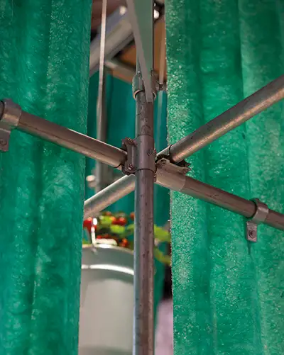 For example, the barjeel roof model on display, inspired by the region’s traditional architecture, can eliminate the use of fans and electricity for ventilation by channelling cooler air in and purging warm air. The same model incorporates green fibreglass “walls”, which assist in retaining cooler air. The colour is intentional: research indicates that green fibreglass as well as green shade nets perform best in reducing the effects of intense sun exposure. Other types of cooling, including concrete blocks that help minimise temperature fluctuations, rammed-earth platforms that incorporate geothermal cooling, and evaporative cooling pads, are also on display. The latter method is less sustainable, as it uses freshwater that evaporates with the help of a fan to lower temperatures. Aboualam’s design instead uses seawater. Together, these prototypes suggest ways in which design can increase the resilience of food systems.