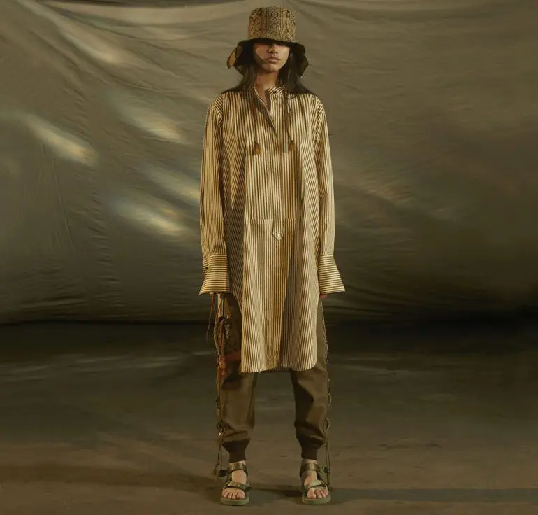 The collection’s earthy palette—drawn from the desert, rocks and minerals, fruit and spices—and military details maintain Qasimi’s DNA of clothes for the urban nomad. Inspiration was taken from Al Sadu, a traditional Bedouin weaving technique. Geometric patterns and stripes traditionally found on tents and mats have been woven into luxurious loungewear, adorning bomber jackets, blousons, trousers and bucket hats. Field jackets, romper suits and tunics in sandy tones call to mind the colours of the desert. A focus on craft is contrasted with an emphasis on technology that lends the collection a sense of futurism.