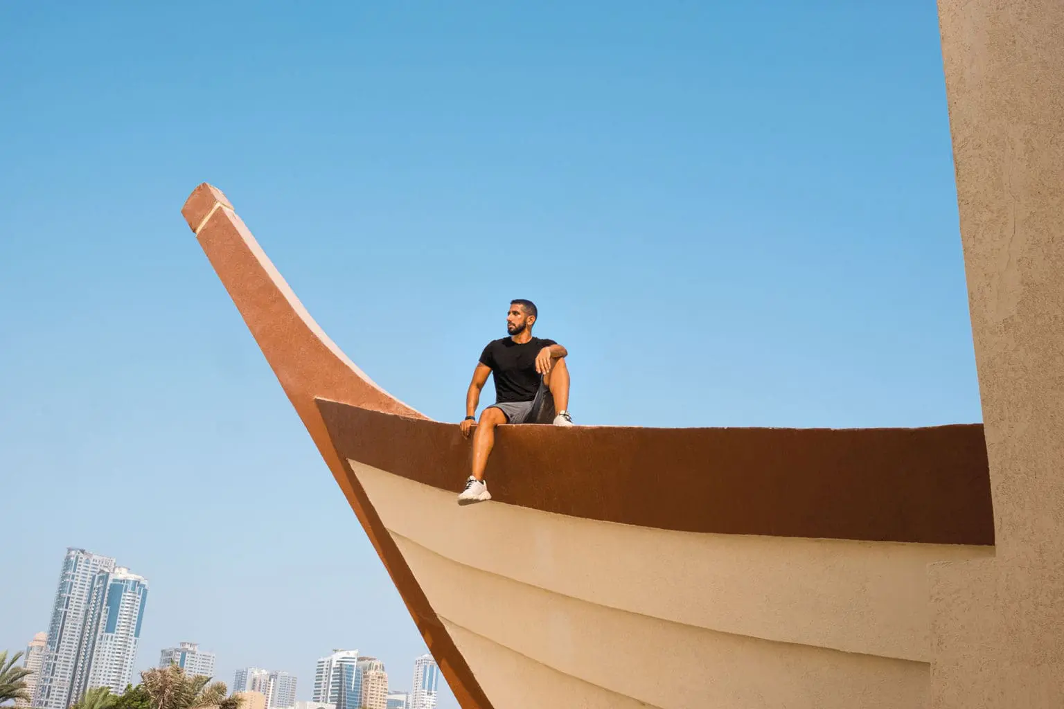 “This has a special place in my heart, it’s a place I connect to.” The monument in Al Majaz Park—the bow of a traditional dhow emerging from a majestic Arab fort, one of a series of landmarks that dot the city by Spanish architect and sculptor Carlos Marinas Rubio—features prominently in Ali’s childhood memories. As it does, he suspects, for many Sharjah-born Emiratis. As a child, perhaps seven, maybe younger, he would go with family and neighbours to the park and climb the monument. It seemed so mighty then, insurmountable even. Once at the top he wondered how he would get down. Ali was always obsessed with adventure, but this was before he became an explorer. The dhow, the most symbolic of Arab seafaring craft, is then a fitting metaphor. The park, now divided in two by Corniche Street, is not a tourist attraction Ali says, but it is nostalgic for those who call the city home.