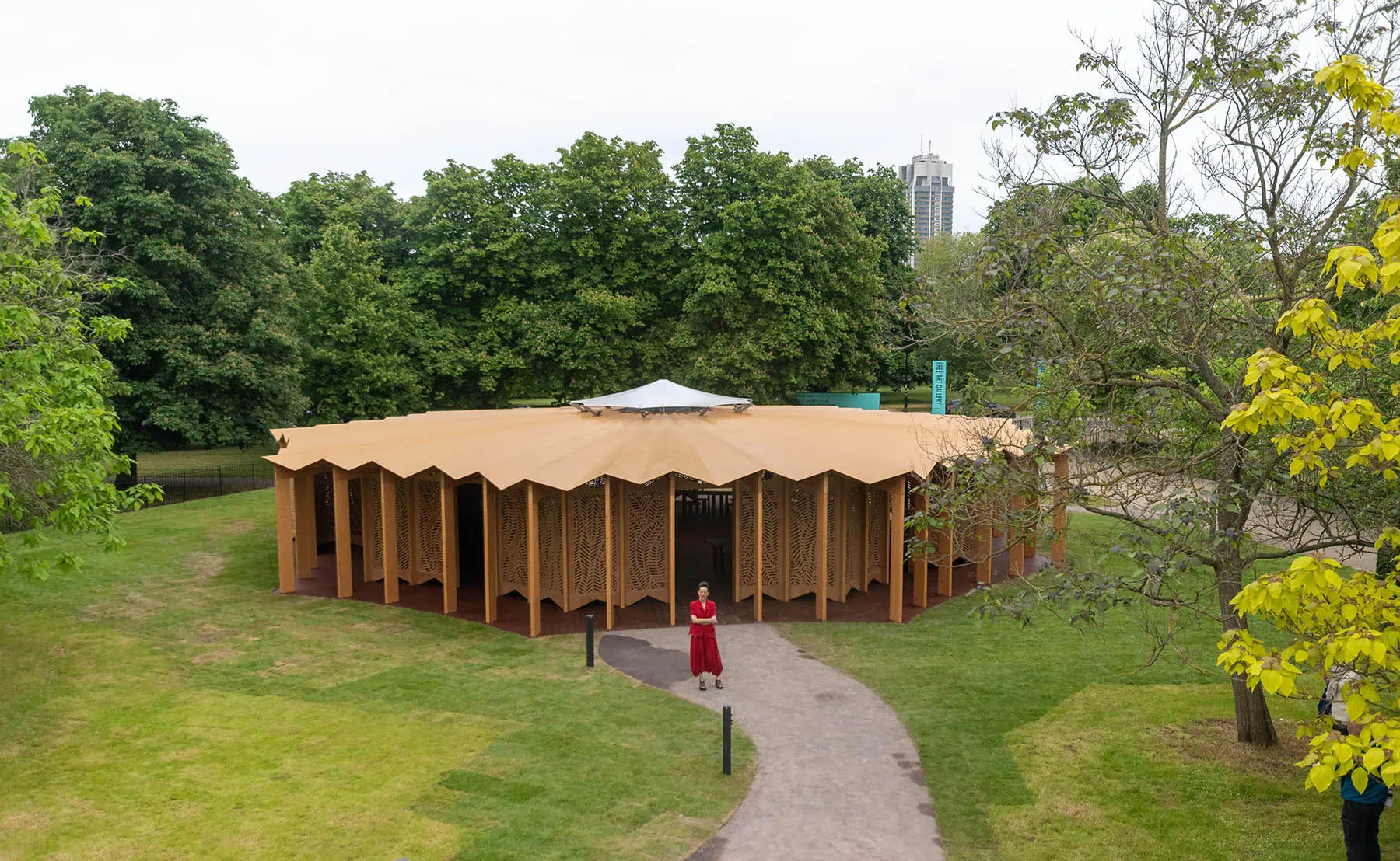 Lina Ghotmeh believes architecture can de-escalate conflict and build community. The philosophy underpins her design for this year’s Serpentine Pavilion, named À table, on view in London until October 29. The French phrase is a call to gather around a table and nourish both mind and body, through dial- ogue and feasting. The Beirut-born, Paris- based architect’s lightweight structure features an umbrella-like, nine-sided roof under which a circular table invites the public to meet, work, eat, and talk. The timber and plywood structure’s low height references the toguna huts of Mali’s Dogon people, which implores people to sit, easing tensions during debate. It in turn keeps the pavilion lower than the surrounding trees. Akin to her insistence that people must come together peacefully, she asserts through design that buildings should emerge quietly from their surrounding environment.