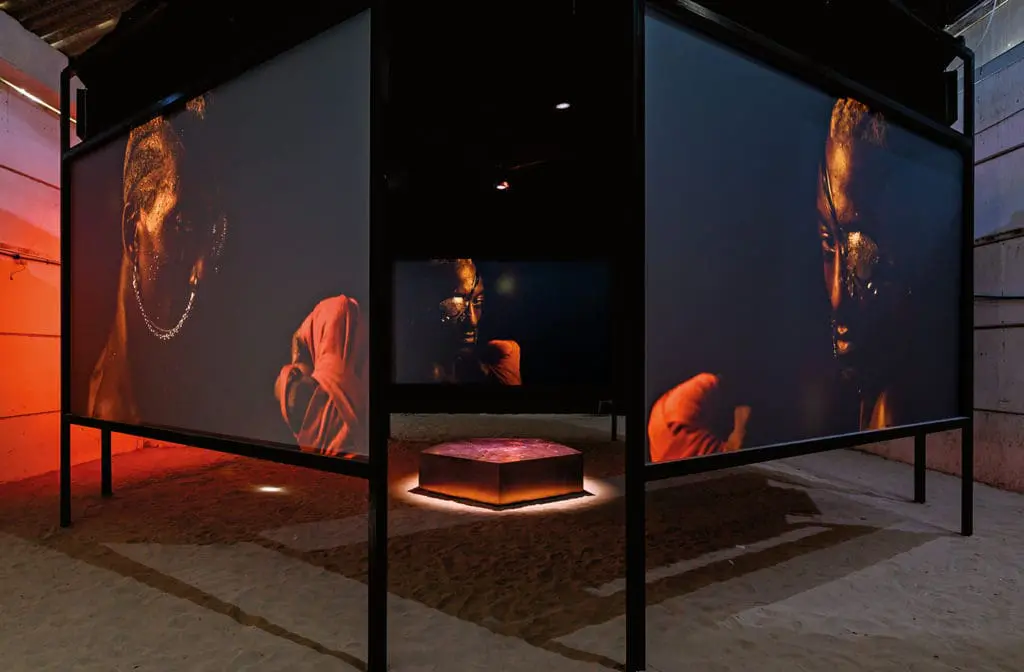 Whispering voices spoke over eerie polyphonic chanting on the newly commissioned film. They quoted various academic writings, such as those of Cheikh Anta Diop, a Senegalese historian and scientist. Upon the screens were performances by choreographer David Hamilton Thomson and former boxing champion Michael Olajide. Tripp described the work as “an asteroid crashing into an ice factory, crystallising fluidity into a fixed form.” The setting was so unusual that viewers wondered whether we, too, had flown in on that asteroid to experience an extra-terrestrial encounter.