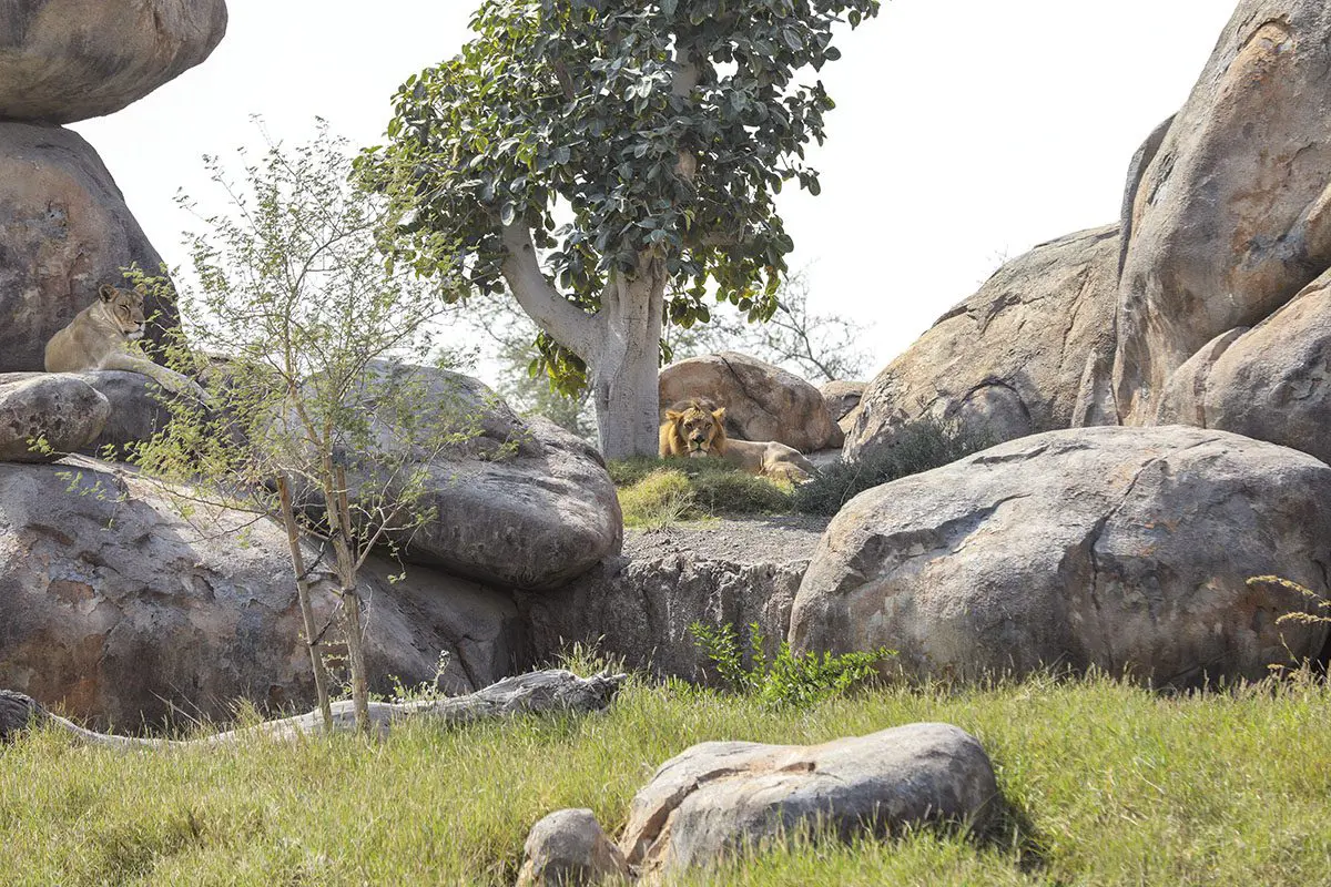 During my visit, on a hot May morning, many animals are sheltering in shaded areas. A fine mist sprayed from hidden posts offers cooling succour from the sun. A male ostrich, its extravagant black plumage shiny and wet from the mist, sits motionless amid the shrubs, other than tiny movements of his head which indicate he is aware he is being watched. We move cautiously to avoid disturbing him further. Two lions, one male, one female, lie in the shade of the earth-toned viewing pavilion—a number of zones have such pavilions so that you can view the animals without being in danger yourself—their bodies close enough to touch were it not for the glass that separates us. In the evening, as the sun cools, they will climb to the top of a rock formation to feed. One innovation serves as an intervention to nature: the man-made rocks are cooled from the inside.
