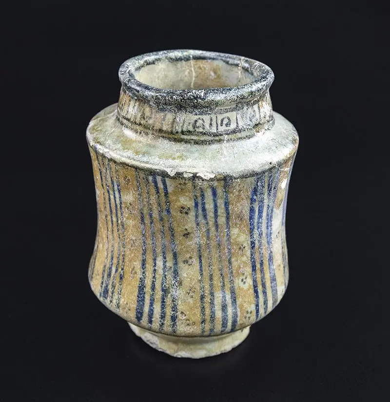 A small jar (Bernaih) A clay vessel used in the field of pharmacology to store medicines and herbs. Origin: Persia. Above, Sine Quadrant A handheld astronomical instrument in copper. Origin: Iraq or Persia, 18-19th century AD.