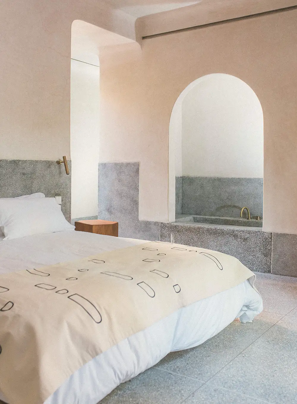 Inside, the same barrel arches are present in the openings to bathrooms, and in ceilings that frame the central staircase made of bone-coloured tadelakt, a type of polished plaster treated with soap. Abouraoui led a team of artisans working with traditional Moroccan materials—tadelakt for walls and ceilings, hand-crafted bejmat tiles on floors, grey and pink terrazzo in guestroom bathrooms—in a way that is central to the spirit of the project. “It’s about anchoring the hotel in its place, creating something that is contemporary but also deeply rooted in Marrakech’s architectural and cultural identity,” he says.
