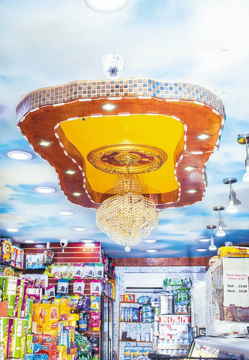 Top, Farah Al Qasimi: Everywhere There is Splendor, installation view, Contemporary Art Museum St. Louis, September 3, 2021 to February 27, 2022. Above, Bodega Chandelier from Back and Forth Disco. The series celebrates individuality and the aesthetic choices that make spaces and surroundings uniquely personal.