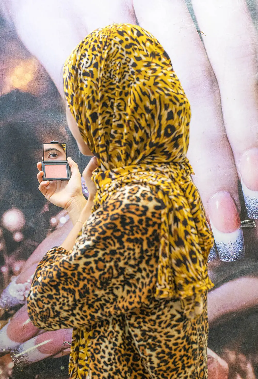 Back and Forth Disco (2020), a series of 17 photographs taken across New York City, highlights her preoccupation with her surroundings. Commissioned by New York’s Public Art Fund and displayed at bus stops, it was one of the few exhibitions viewable at the beginning of the pandemic. In one image, a woman in a leopard-print hijab and blouse, her back to the camera, looks at herself in a pocket makeup mirror, her eye the only visible part of her face. In another, a barber cutting hair is seen through a series of mirror-within-mirror reflections; flanking his station are posters, featuring various hairstyles, that have taken on an inexplicable cerulean tint.
