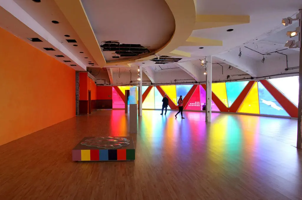 In 2015, as Architecture Consultant for the Sharjah Art Foundation (SAF), my engagement with the Flying Saucer became more intimate. The Sharjah government had acquired it as a venue for the Foundation and first used it for Sharjah Biennial 12. An Egyptian artist, Hassan Khan, created a site-specific installation, UFO! UFO?, in collaboration with Andeel, one of Egypt’s best-known cartoonists. Two billboards punctuated the passerby’s changing perspective with cartoons that used humour as social critique. Inside, the artist introduced coloured light filters on the façade as a mediator between the internal and external experience of the building as a monument.