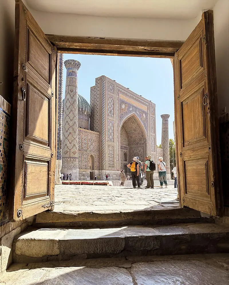 The Kalyan Minaret (opening image), and the Poi Kalyan complex of which it is part, is a symbol of Bukhara. When Genghis Khan invaded the city in the 13th century, he was said to be so impressed by the minaret that he spared it from destruction. The Sher Dor Madrasa (above), on Samarkand’s Registan. The entrance portal is embellished with two roaring lions. Minaret photo: Julian Elliott; Madrasa: Peter Drennan.