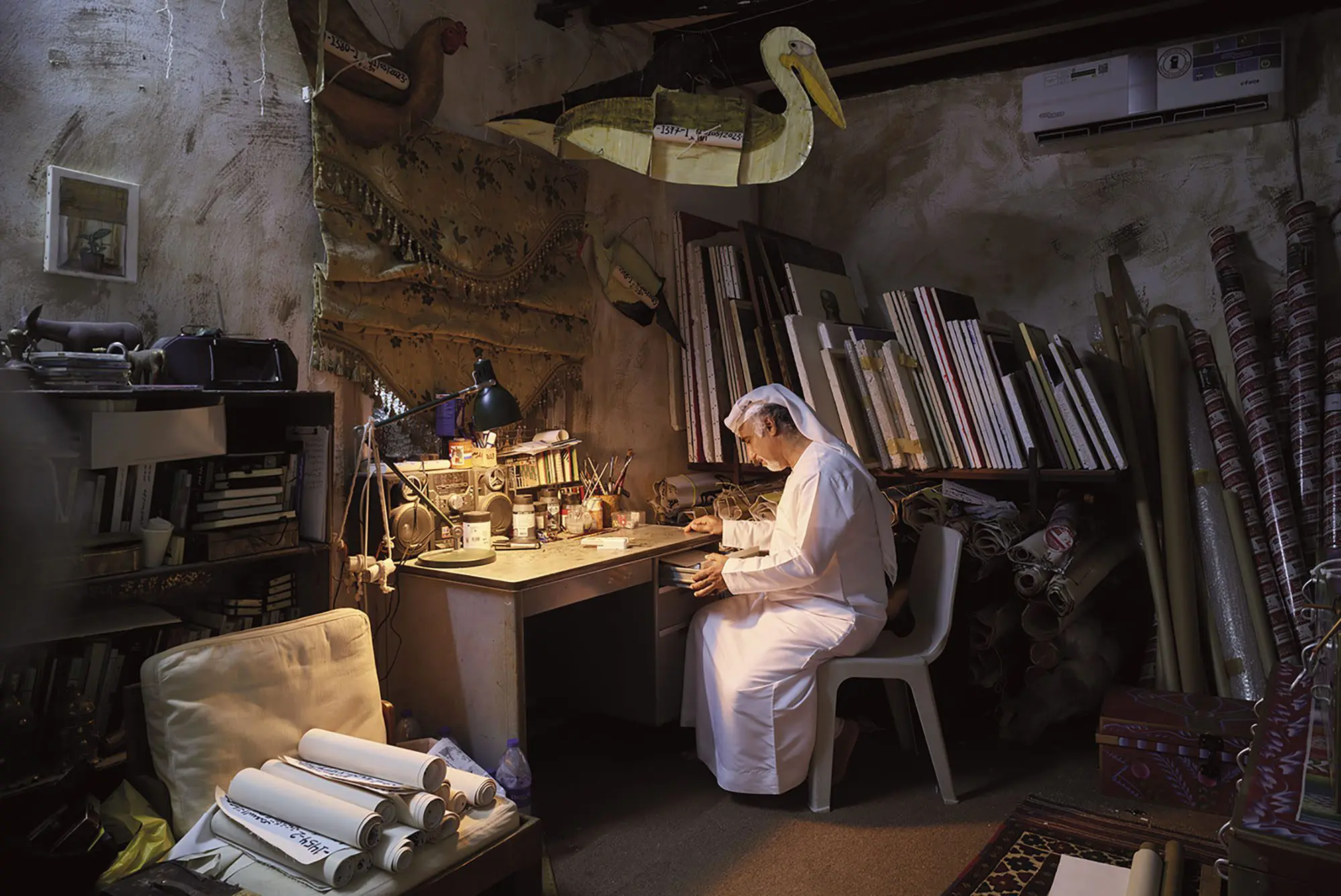A key figure in the UAE’s contemporary art scene, Abdullah Al Saadi’s prolific practice ranges from painting, drawing, sculpture, performance and photography to collecting and cataloguing found objects. The artist has created a comprehensive body of work connected to the landscapes of the Arabian Peninsula. His exhibition in Venice will be curated by Tarek Abou El Fetouh, above, with whom Al Saadi collaborated on a public intervention in Expo 2020 Dubai. Al Saadi in his studio photographed by Roman Mensing, both courtesy The National Pavilion UAE—La Biennale Di Venezia.