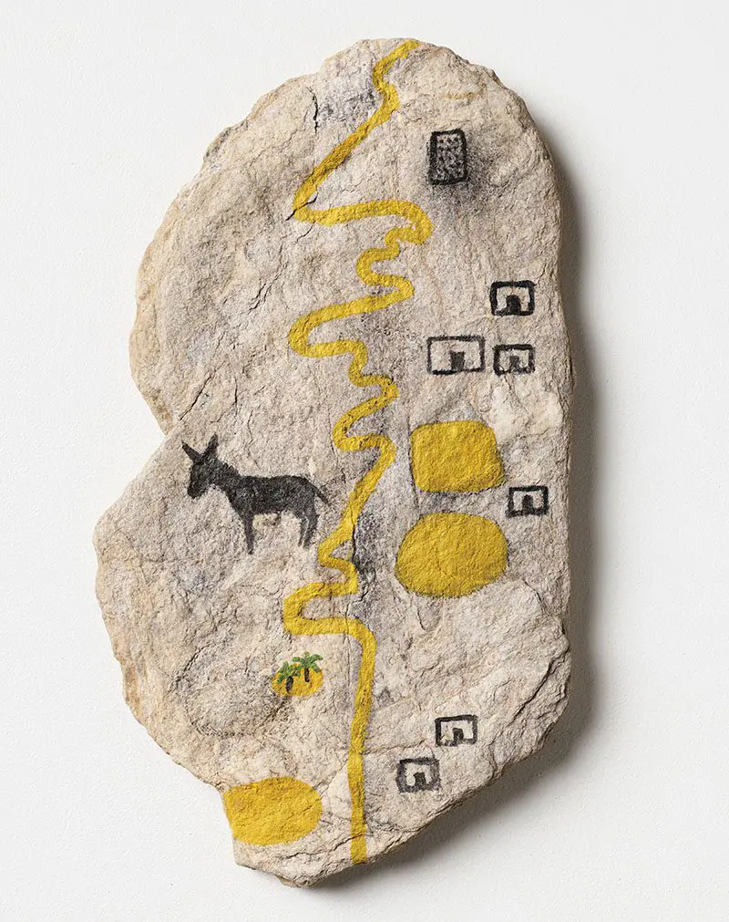 The Slipper’s Journey comprises 85 small stones and rocks upon which he has painted abstract musings. For the journey, which took place in 2015, the artist walked through mountain villages of the UAE’s eastern region wearing slippers (zannoba) that he had made from rubber and goat skin and during which he transported his supplies in a wheelbarrow. A Journey in the Footsteps of Camar Cande by Car (2017) was a reiteration of his 2010-2011 expedition with his dog and a donkey named Camar Cande. Here, he produced a series of drawings and paintings encased in old biscuit tins, which capture a sense of nostalgia but also of treasure to be discovered.