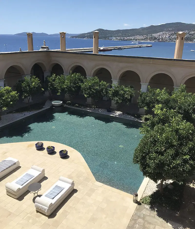 Imaret is a place to come to alone in the depths of winter with a good book and a cosy cashmere shawl, to curl up in a chair as the rain falls outside, to hear the thunk of another log being thrown on the fire and the chestnut floorboards creak as tea is brought in. It’s a place to enjoy in summer with a loved one, to sit on the sunny terrace as the waters of the bay sparkle below, the hills around the town looking Monegasque in the afternoon light. It’s a place to enjoy by day, when Aegean sunshine filters through the windows, bathing everything in a warm light that glints off the crystal chandeliers, and to soak up at night, when the courtyards glow with candlelight and log fires crackle around the pool.