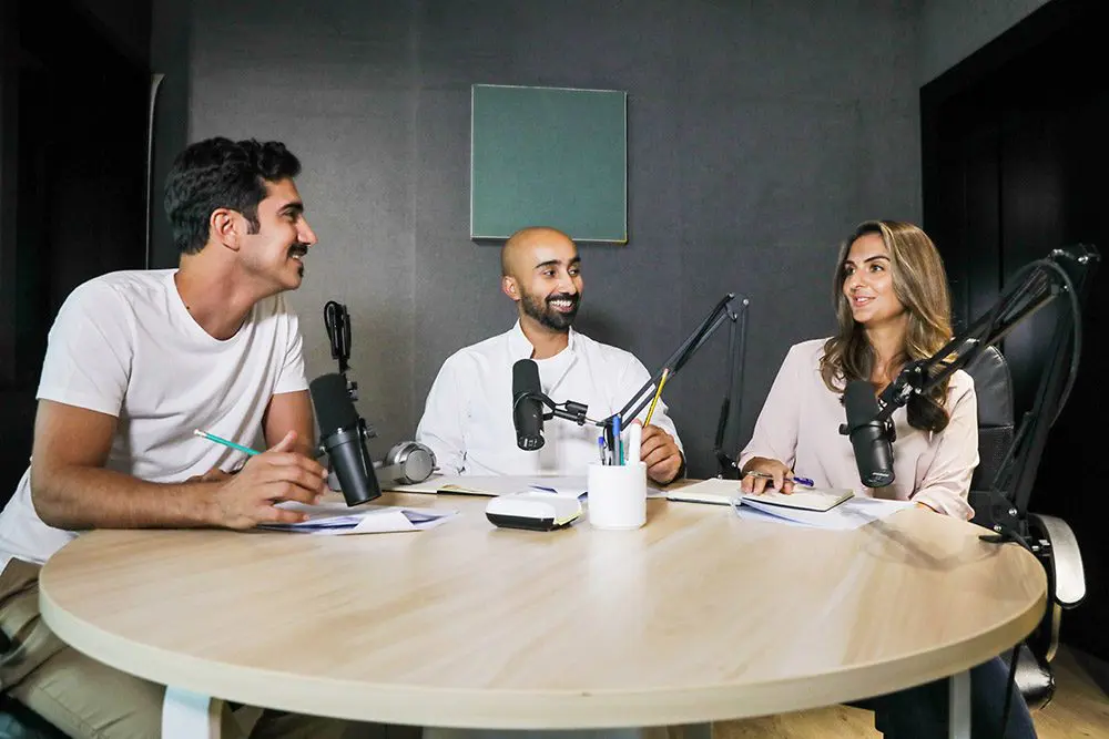 Al Qassimi and co-founders Mshari Alonaizy and Leila Hamadeh created Finyal Media, a podcast production company, in 2019 to create content for young Arabs. It was acquired last September by Sowt Media. Photo: Finyal media