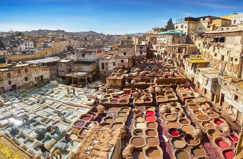 Chouara Tannery is the largest and one of the oldest in Fez. The tanneries operate much as they have always done. Round stone vessels are filled with liquids that soften and colour the hides. Photo: Alamy.