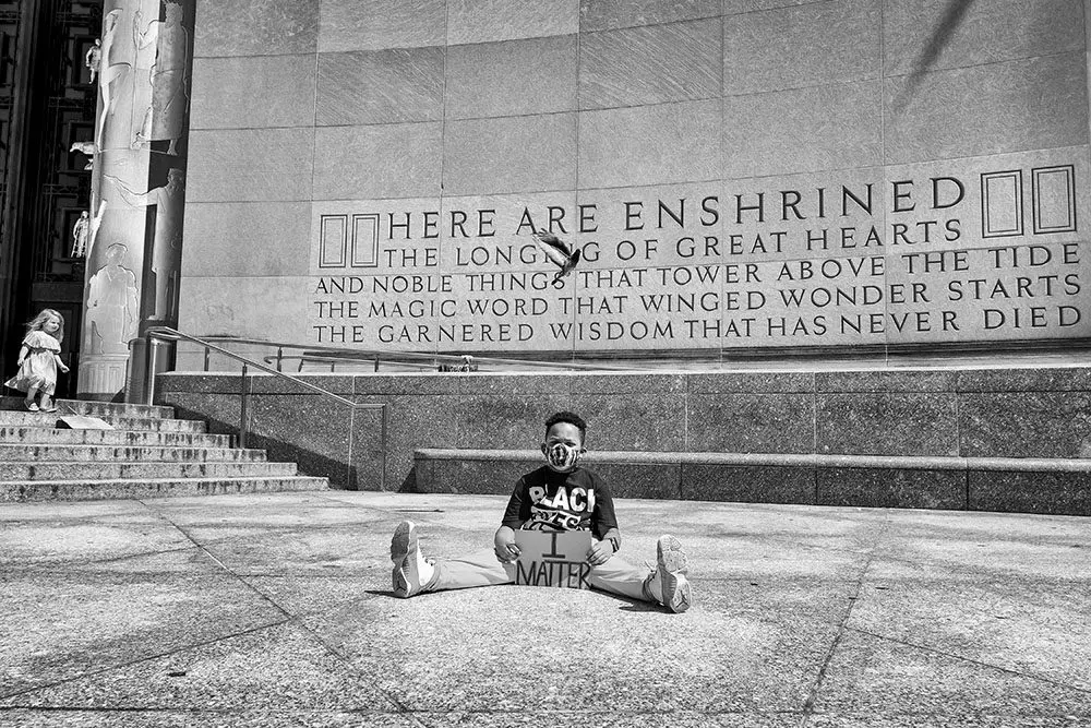 Karen Zusman captured the early days of the Black Lives Matter protests in New York City following the murder of George Floyd in BLM Justice Rides in NYC, 2020. First, Zusman was on foot, and then by bike—the weekly “Justice Rides”—offering the viewer the perspective of documenting and protesting at the same time.