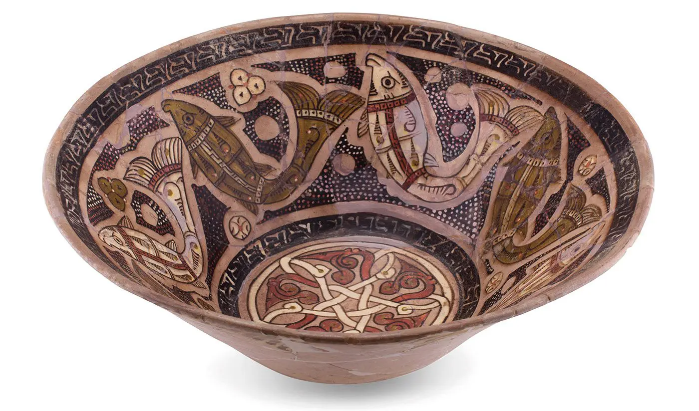 The exhibition has four themes: ‘The Blessings of Water and Islam’, ‘Water and Daily Life’, ‘Traditional Hammams’ and ‘Gardens’. Objects include a basin made from copper and decorated with gold and silver that was used by King Sultan al-Malik Al Nāsir Al Dīn Muhammad Ibn Qalāwūn in the first half of the 14th century. There’s a 16th century Ottoman ceramic plate with the image of a multicoloured jug, and a bronze jug decorated with gold animals. Objects from the 19th century include a jug and a huge basin made from Ottoman tombac (a copper-zinc alloy) inlaid by gold-plated copper and a kashkul, or begging bowl. One of the older items is a bronze ewer (water jug) from 10th century India, its globular shape resting on a circular, slightly splayed foot, the body chased with bands reminiscent of a turban’s folds.