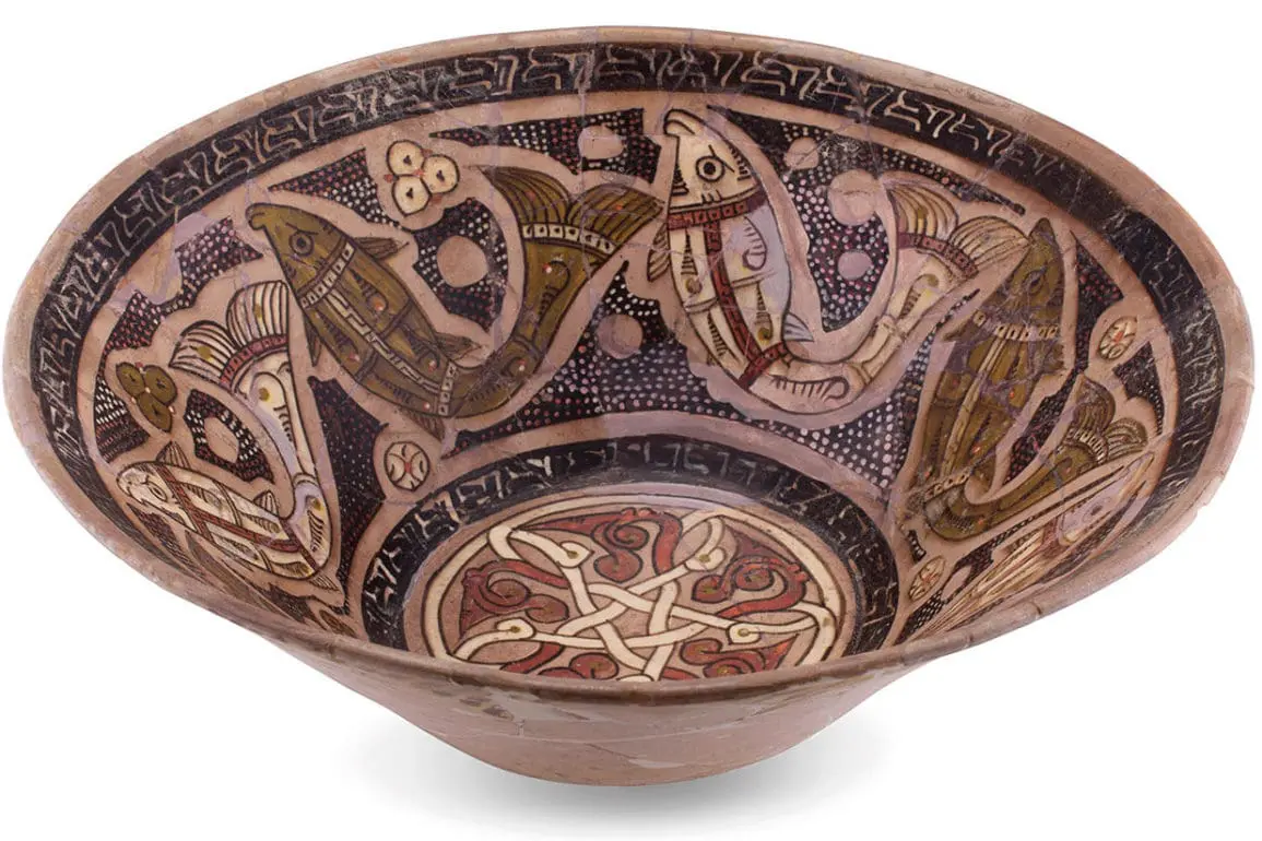 The exhibition has four themes: ‘The Blessings of Water and Islam’, ‘Water and Daily Life’, ‘Traditional Hammams’ and ‘Gardens’. Objects include a basin made from copper and decorated with gold and silver that was used by King Sultan al-Malik Al Nāsir Al Dīn Muhammad Ibn Qalāwūn in the first half of the 14th century. There’s a 16th century Ottoman ceramic plate with the image of a multicoloured jug, and a bronze jug decorated with gold animals. Objects from the 19th century include a jug and a huge basin made from Ottoman tombac (a copper-zinc alloy) inlaid by gold-plated copper and a kashkul, or begging bowl. One of the older items is a bronze ewer (water jug) from 10th century India, its globular shape resting on a circular, slightly splayed foot, the body chased with bands reminiscent of a turban’s folds.