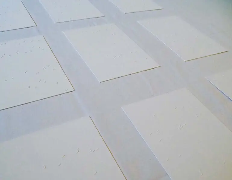 Like the inherent or invisible music in the Arabic language, harakat (vocalisation marks) intimate music and create material rhythm. 33 Songs is composed of 330 such sheets. Photo courtesy of the artist.