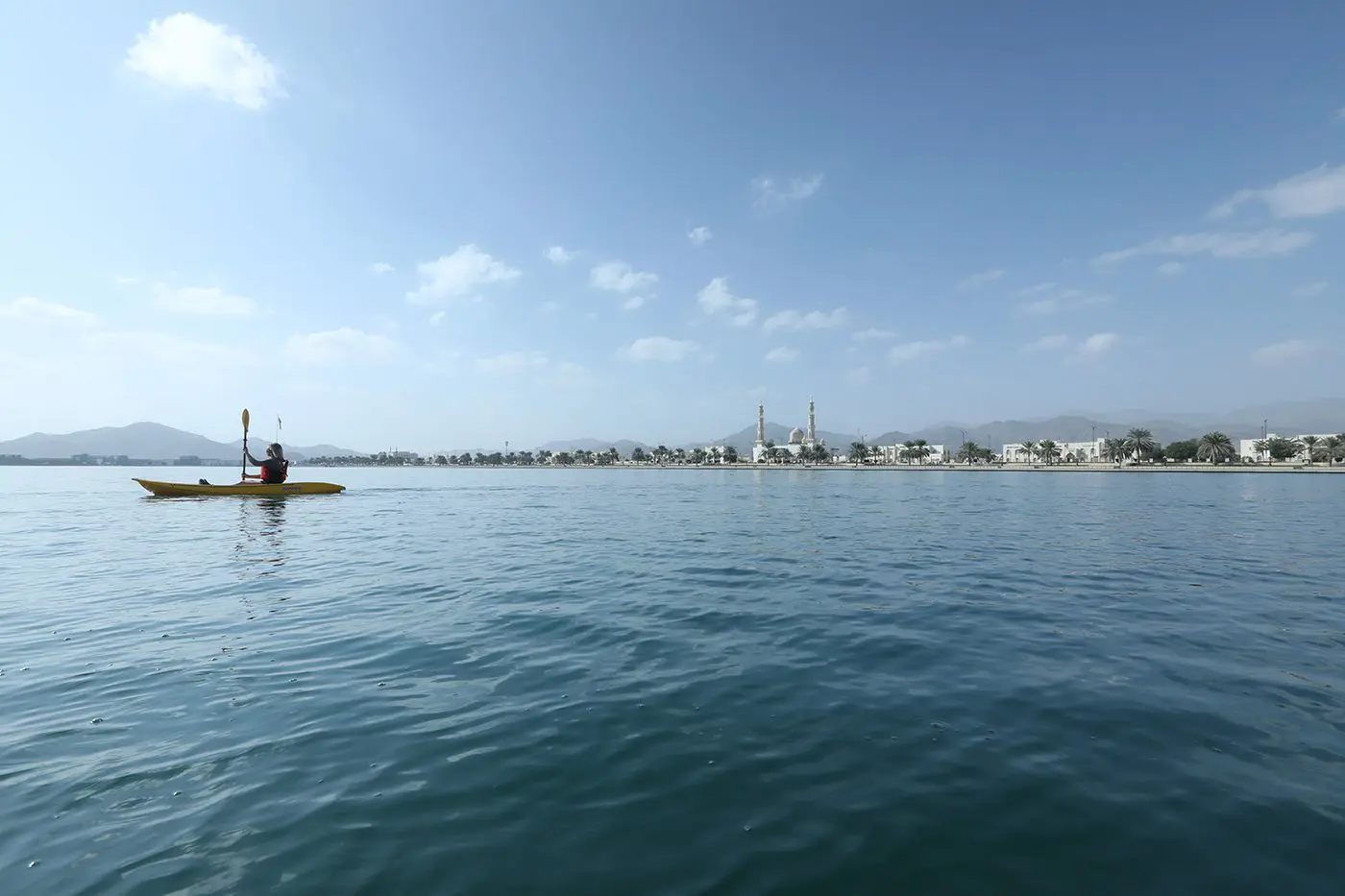 When Khor Kalba’s water recedes, it surges through an estuary and out to the Gulf of Oman. We are carried along by the gentle tide to an expansive lake that was constructed several years ago alongside the Kalba corniche. A mosque gleams into view, its white minarets outlined against the grey-brown mountains. In the distance, egrets and cormorants skim the surface of the lake. A heron lands on a mud flat, looking for lunch. When our arms tire, we pause and float beneath a piercing blue sky, looking out for turtles, or at least their heads emerging from the water as they come up for air.